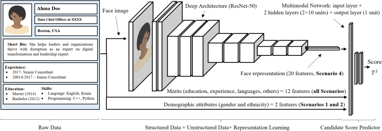 We present a new experimental framework aimed to study how multimodal machine learning is influenced by biases. The framework is designed as a fictitious automated recruitment system, which takes a feature vector with data obtained from a resume as input to predict a score within the interval [0, 1]. We have generated 24,000 synthetic resume profiles including 12 features obtained from 5 information blocks and 2 demographic attributes (gender and ethnicity), and a feature embedding with 20 features extracted from a face photograph. Each profile has been associated according to the gender and ethnicity attributes with an identity of the DiveFace database, from which we get the face photographs.